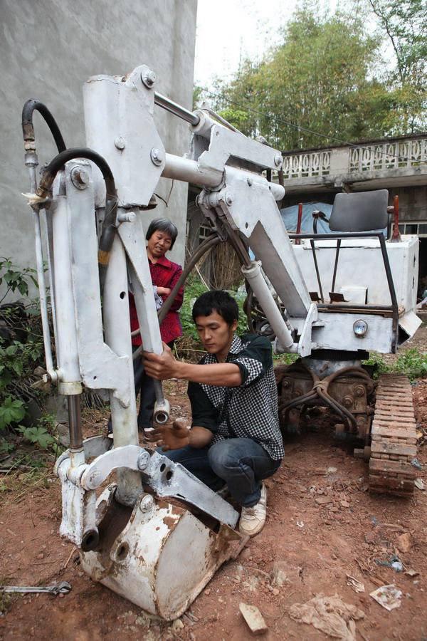 Dai Yuanwu displays his design sketch on May 5, 2015. The 25-year-old man spent three months to design and three days to make an excavator in Neijiang, Sichuan province. According to him, he has made two different machines before. Not only did it work perfectly, Dai also optimized it to meet his needs. He spent less than 40,000 yuan ($6,448) making it when a commercially available model costs 100,000 yuan or even 200,000 yuan.(xinhua) |