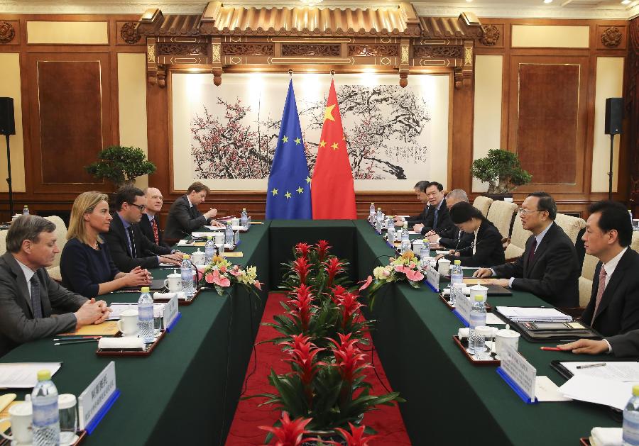Chinese State Councilor Yang Jiechi (2nd R) co-chairs the fifth round of high-level strategic dialogue between China and the European Union (EU) with Federica Mogherini (2nd L), EU High Representative for Foreign Affairs and Security Policy and Vice President of the European Commission, in Beijing, capital of China, May 5, 2015. (Xinhua/Ding Lin) |