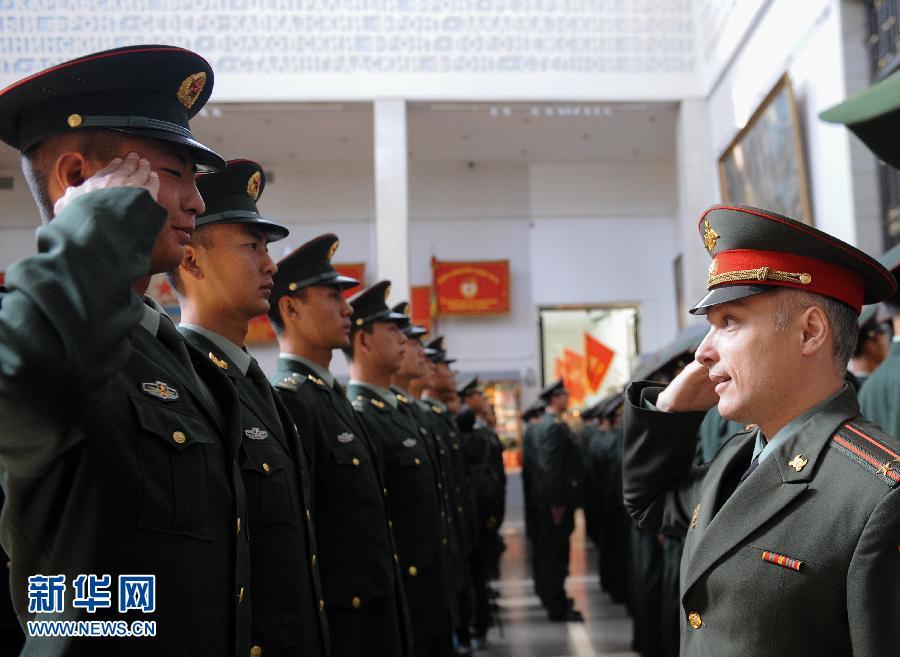 Chinese guards of honor were awarded medals Wednesday by the Russian Defense Ministry to commemorate their participation in the upcoming Victory Day parade on May 9. The guards of honor of the three services of the Chinese People's Liberation Army, consisting of 112 members, attended the award ceremony in the exhibition hall of the Central Armed Forces Museum. (Photo/Xinhua) |