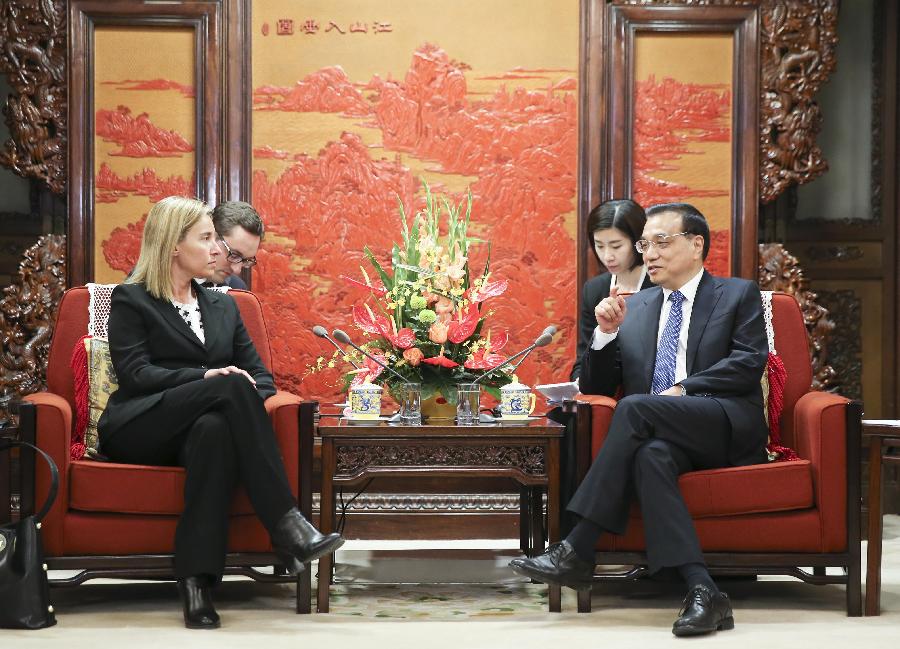 Chinese Premier Li Keqiang (R, front) meets with Federica Mogherini, European Union (EU) High Representative for Foreign Affairs and Security Policy and Vice President of the European Commission, in Beijing, capital of China, May 6, 2015. (Xinhua/Ding Lin) |