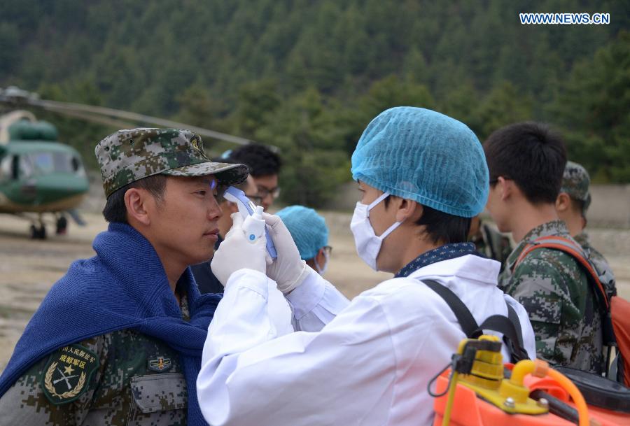 An inspection and quarantine worker measures body temperature for a helicopter crew member in Gyirong County, southwest China's Tibet Autonomous Region, May 6, 2015. Three helicopters from China's air force flew to Nepal on Wednesday morning to help with transportation and rescue. (Xinhua/Wang Shoubao) |