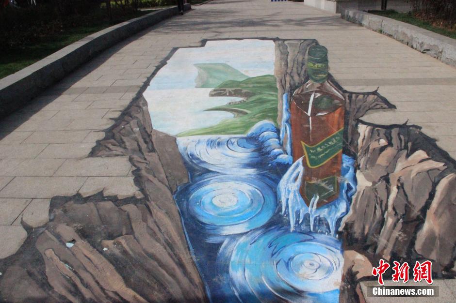 3D street paintings in Xi'an attract many people to take photos with the amazing special effects. Featuring cliff, waterfall, and trap etc., these vivid 3D paintings have become unique scenery on the street of Xi'an. (Chinanews/Fang Qin)