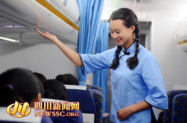 To celebrate the Chinese Youth Day, the students in a college of aeronautics hold a retro party in a plane in Chengdu, southwest China’s Sichuan province on May 4, 2015. Wearing traditional clothes and twist pigtails to be students of the Republican Period (1912-1949), the girls enjoyed this romantic party with the “passengers”. (Photo source: newssc.org)