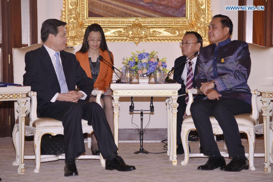 Thai Prime Minister Prayuth Chan-ocha (R, front) meets with Chinese State Councilor Yang Jing (L, front) at the Government House in Bangkok, Thailand, May 7, 2015. (Xinhua/Rachen sageamsak) |