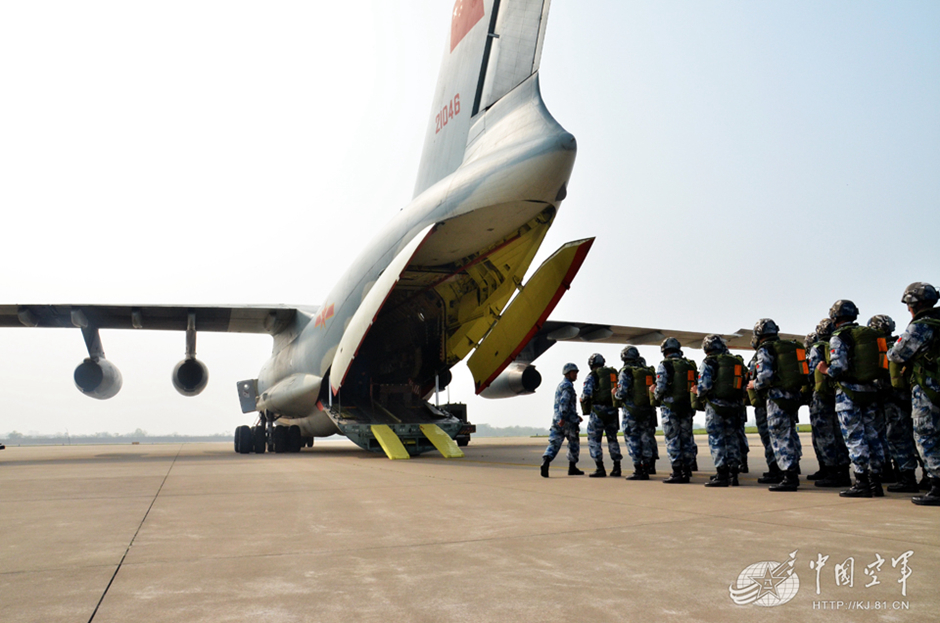 Airborne troops of the People's Liberation Army (PLA) conduct parachuting training recently. The IL-76 plane they took is a large Russian-made, four-engine multipurpose aircraft. (CNS Photo)