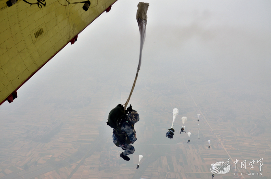 Airborne troops of the People's Liberation Army (PLA) conduct parachuting training recently. The IL-76 plane they took is a large Russian-made, four-engine multipurpose aircraft. (CNS Photo)