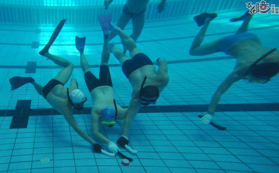 The Handan municipal natatorium hosts a group of people with an average age of 30. They dive to the bottom of the pool to compete for the puck. The players will come up for breath and resume play once they have recovered.(Photo/cqnews.net)