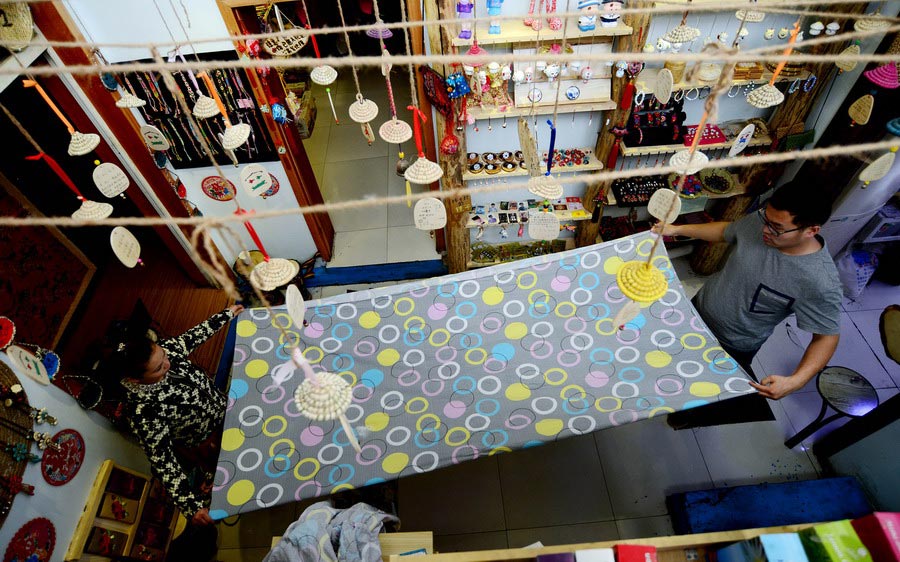 Chen Anjie (R) is busy on the phone as his girlfriend aranges the accessories in his inn in Jinan, capital of east China's Shandong province, May 6, 2015. (Xinhua/Zhao Xiaoming)