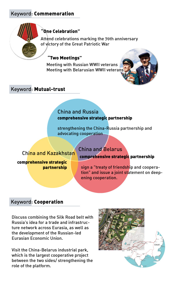 The Eurasian Economic Union was established on January 1, 2015 and Russia, Belarus and Kazakhstan are all its members. Xi first put forward the strategic initiative of One Road and One Belt in Kazakhstan in 2013. Right now, China and Kazakhstan have signed several ten billion USD worth of cooperation contracts. During Xi's visit to Russia, the two countries will discuss the cooperation between the Silk Road Economic Belt and Russia's trans Eurasia passageway and the development of the Eurasian Economic Union. When visiting Belarus, Xi will attend an economic and trade forum between local governments of the two countries and visit the China-Belarus industrial park, which is the largest cooperative project between the two sides.