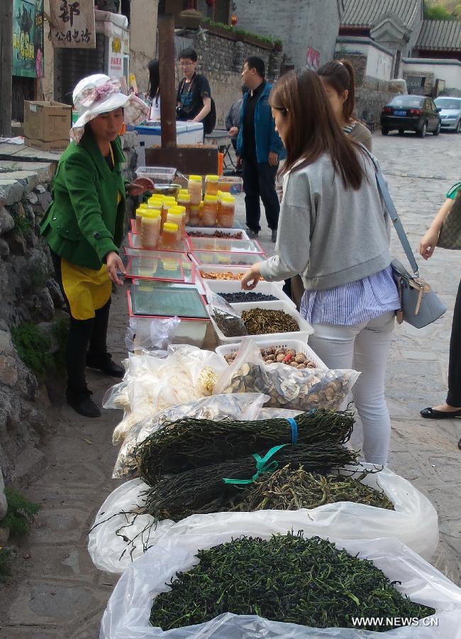 Tourists purchase mountain products at Chuandixia village on the outskirts of Beijing, capital of China, May 9, 2015. Chuandixia village, a mountainous village built in the Ming and Qing dynasties, is listed as the cultural heritage under the key protection of Beijing. The residential buildings in the village have maintained the original housing style. (Xinhua/Li Xin) |