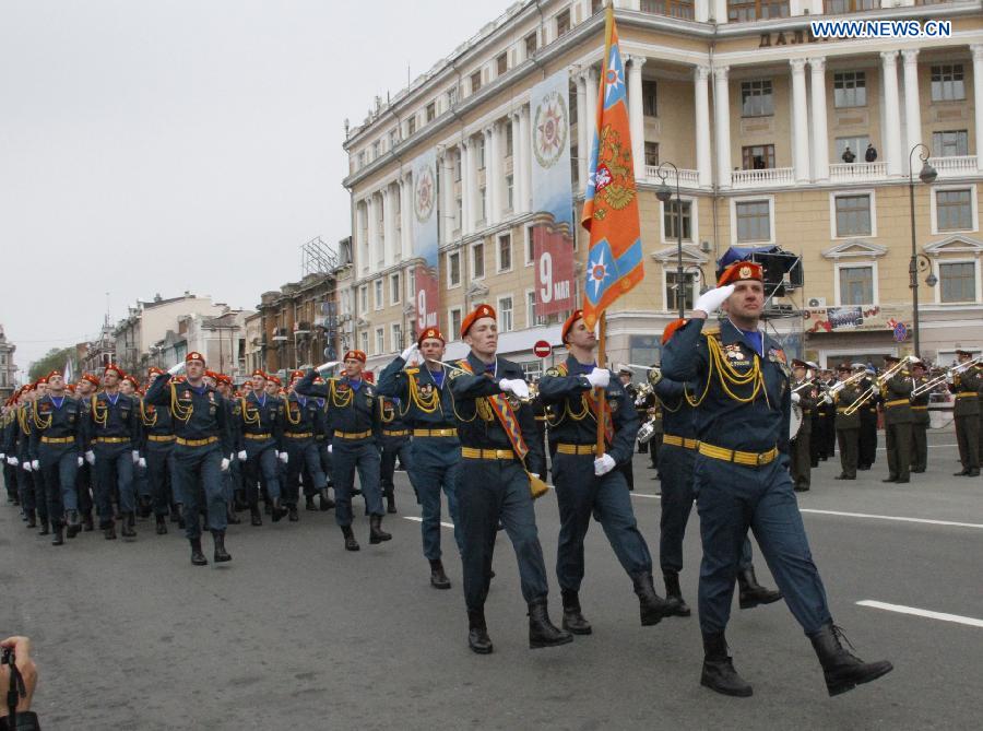 Russian soldiers take part in the military parade marking the 70th anniversary of the victory in the Great Patriotic War, in Vladivostok, Russia, May 9, 2015. (Xinhua/Zhu Yushu)