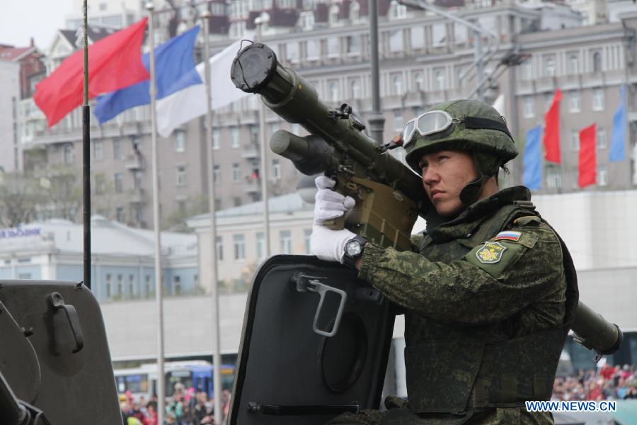 A Russian soldier is seen during the military parade marking the 70th anniversary of the victory in the Great Patriotic War, in Vladivostok, Russia, May 9, 2015. (Xinhua/Valery)