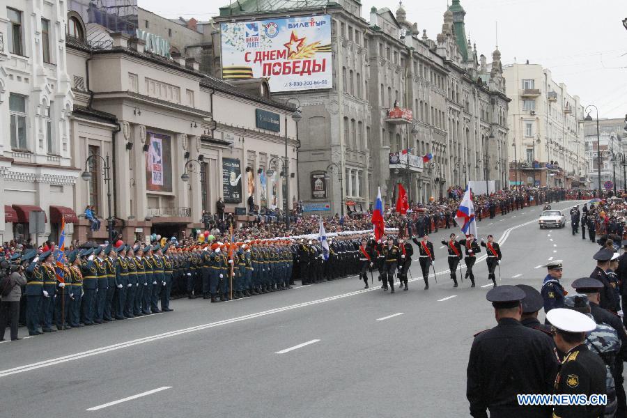 Russian soldiers take part in the military parade marking the 70th anniversary of the victory in the Great Patriotic War, in Vladivostok, Russia, May 9, 2015. (Xinhua/Zhu Yushu)