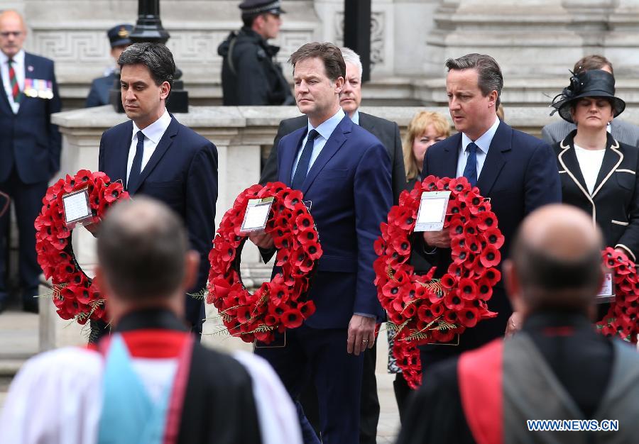 British Prime Minister David Cameron, outgoing Liberal Democratic Party leader Nick Clegg and outgoing opposition Labour Party leader Ed Miliband (Central Row, from R to L), attend a VE Day service of remembrance at the Cenotaph on Whitehall to commemorate the 70th anniversary of the end of the World War II in Europe in London, Great Britain, on May 8, 2015. (Xinhua/Han Yan) |
