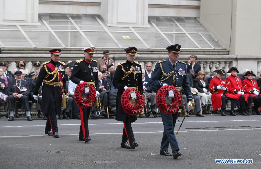 Military soldiers take part in a VE Day service of remembrance at the Cenotaph on Whitehall to commemorate the 70th anniversary of the end of the Military soldiers take part in a VE Day service of remembrance at the Cenotaph on Whitehall to commemorate the 70th anniversary of the end of the World War II in Europe in London, Great Britain, on May 8, 2015. (Xinhua/Han Yan) |