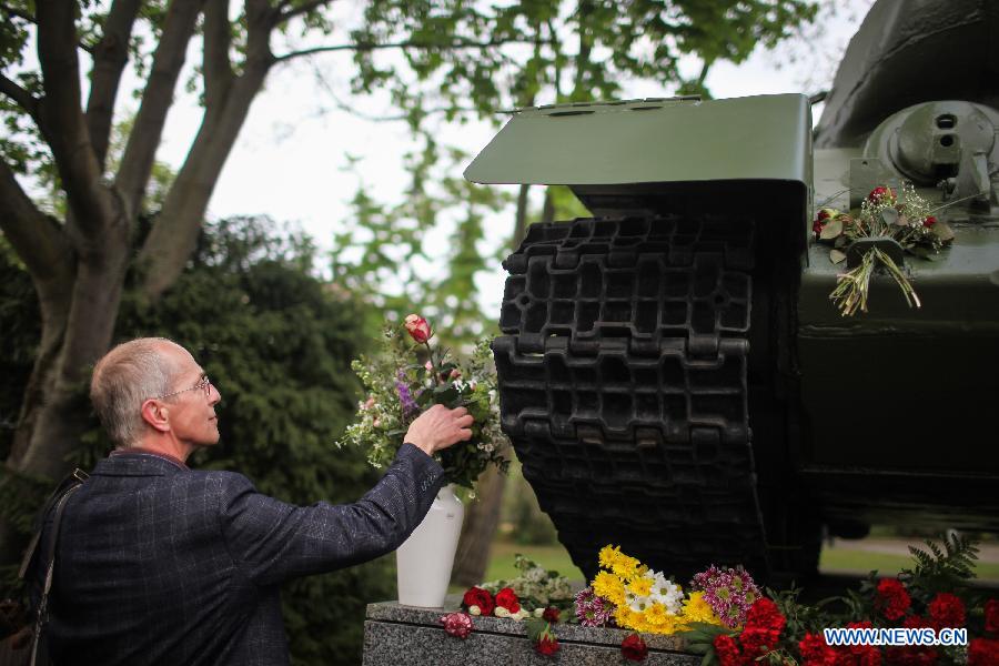 A visitor presents flowers near a tank model during a memorial ceremony marking the 70th anniversary of the end of World War II at the German-Russian Museum in Berlin, Germany, May 8, 2015. (Xinhua/Zhang Fan)