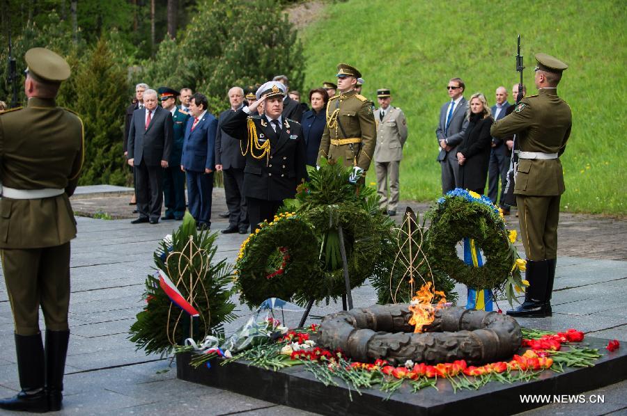 People attend the commemoration marking the 70th anniversary of World War II victory in Europe in Vilnius, Lithuania, on May 8, 2015. (Xinhua/Alfredas Pliadis)