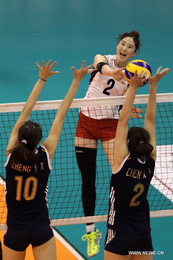 Go Yerim (top) of South Korea spikes the ball against Zheng Yixin (L) and Chen Xintong of China during a semifinal of the 1st Asian U-23 Women's Volleyball Championship in Pasig City, the Philippines, May 8, 2015. China won 3-0. (Xinhua/Rouelle Umali) |