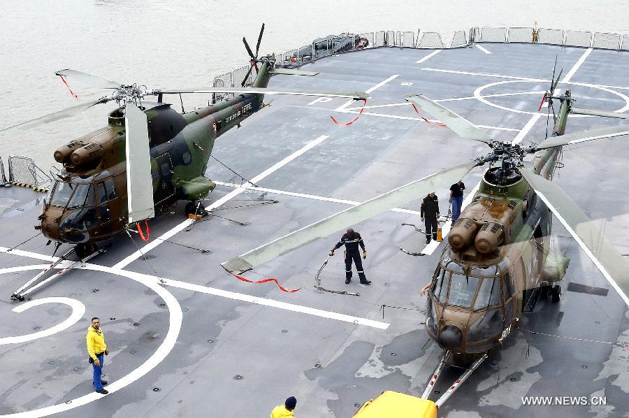 Helicopters are seen on the deck of French Mistral-class protection and command (BPC) ship Dixmude at the Wusong naval port in Shanghai, east China, May 9, 2015. A French naval taskforce consisted of the BPC ship Dixmude and the frigate Aconit arrived in Shanghai on Saturday for a 7-day visit. (Xinhua/Chen Fei)