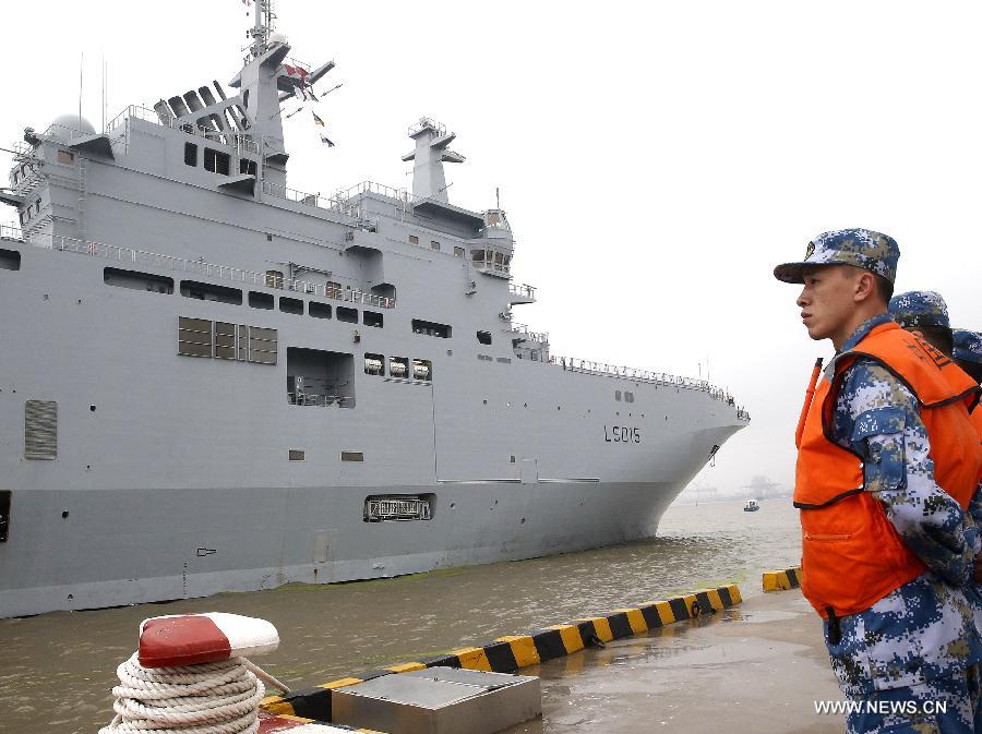 French Mistral-class protection and command (BPC) ship Dixmude arrives at the Wusong naval port in Shanghai, east China, May 9, 2015. A French naval taskforce consisted of the BPC ship Dixmude and the frigate Aconit arrived in Shanghai on Saturday for a 7-day visit. (Xinhua/Chen Fei)