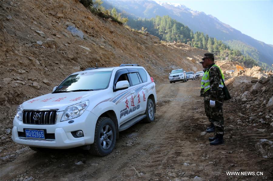 Excavators work to clear a landslide-disrupted roadway linking Gyirong Town and Gyirong port in Xigaze City, southwest China's Tibet Autonomous Region, May 8, 2015. The traffic of this 27-kilometer-long road was resumed on Friday after a 13-day rush repair. The region was severely hit by the April 25 Nepal earthquake. (Xinhua/Pi Feng)