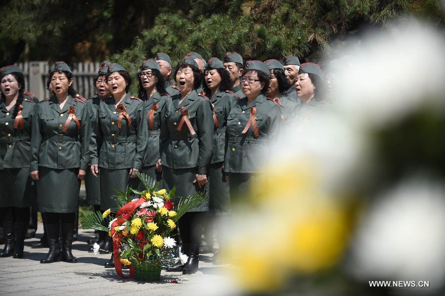 People take part in a ceremony to commemorate the 70th anniversary of the victory of the World Anti-Fascism War, at the Soviet Martyrs' Park in Shenyang, capital of northeast China's Liaoning Province, May 9, 2015. (Xinhua/Pan Yulong)