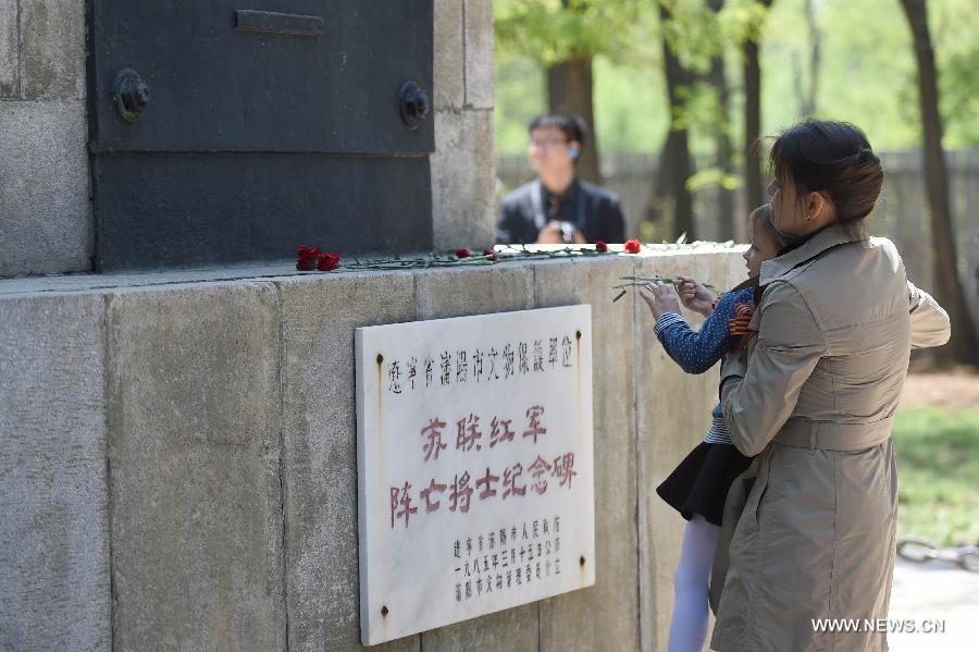 People present flowers during a ceremony to commemorate the 70th anniversary of the victory of the World Anti-Fascism War, at the Soviet Martyrs' Park in Shenyang, capital of northeast China's Liaoning Province, May 9, 2015. (Xinhua/Pan Yulong)