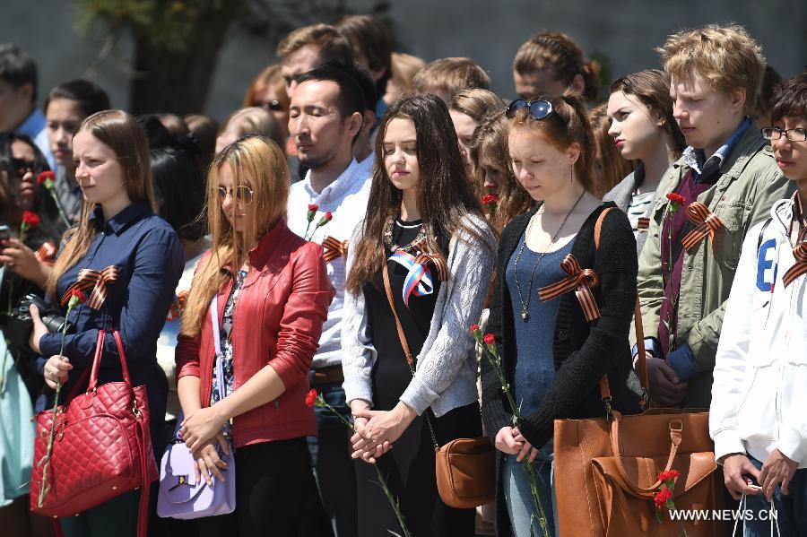 People stand in silence during a ceremony to commemorate the 70th anniversary of the victory of the World Anti-Fascism War, at the Soviet Martyrs' Park in Shenyang, capital of northeast China's Liaoning Province, May 9, 2015. (Xinhua/Pan Yulong)