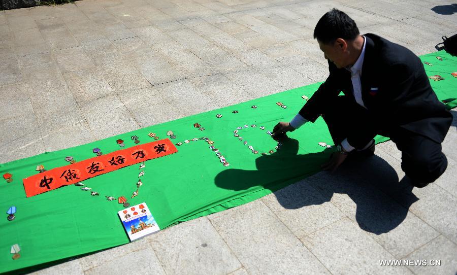 A man lays a medal during a ceremony to commemorate the 70th anniversary of the victory of the World Anti-Fascism War, at the Soviet Martyrs' Park in Shenyang, capital of northeast China's Liaoning Province, May 9, 2015. (Xinhua/Pan Yulong)