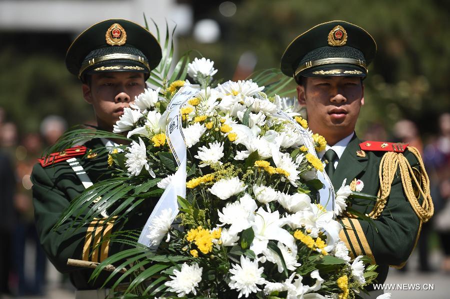 Soldiers lay a wreath during a ceremony to commemorate the 70th anniversary of the victory of the World Anti-Fascism War, at the Soviet Martyrs' Park in Shenyang, capital of northeast China's Liaoning Province, May 9, 2015. (Xinhua/Pan Yulong)