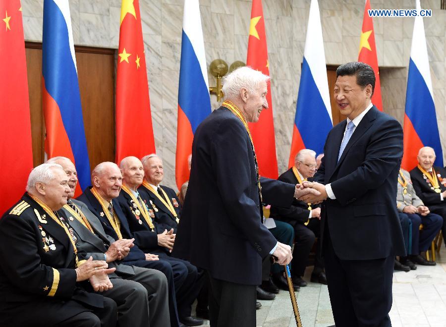| Chinese President Xi Jinping (R, front) shakes hands with a Russian veteran in Moscow, Russia, on May 8, 2015. Xi met with 18 representatives of Russian veterans who fought dauntlessly on the battlefield in northeast China during the anti-Japanese war and in Russia's Great Patriotic War in Moscow on Friday. (Xinhua/Rao Aimin) |