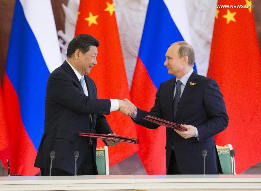 Chinese President Xi Jinping (L) shakes hands with his Russian counterpart Vladimir Putin during the signing of a joint statement after their talks in Moscow, capital of Russia, May 8, 2015. (Xinhua/Huang Jingwen)