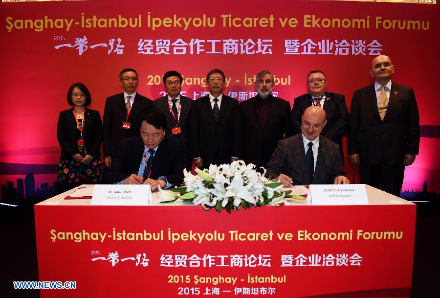 President of Shanghai Chamber of Commerce for Import and Export Wang Xinpei (L, front) and Turkey's Foreign Economic Relations Board President Omer Cihad Vardan (R, front) sign cooperation agreement at the "Belt and Road Initiative" Trade and Economy Forum in Istanbul, Turkey, on May 8, 2015. (Xinhua/He Canling) |