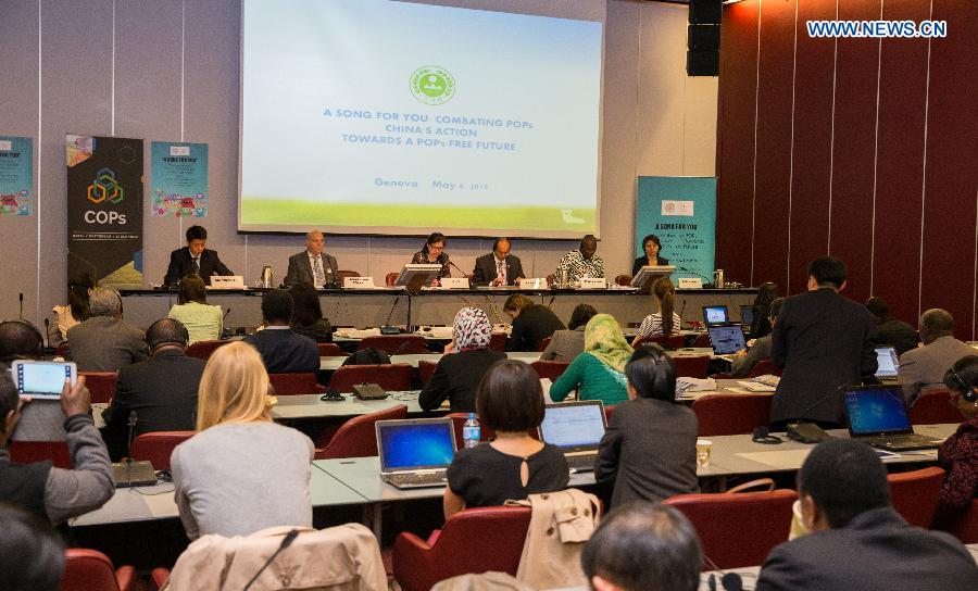 Delegates take part in a side event during the seventh meeting of the conference of the parties to the Stockholm Convention in Geneva, Switzerland, May 8, 2015. UN officials on Friday hailed China's achievement in the effort to reduce, abandon and control the persistent organic pollutants (POPs) in the seventh meeting of the Conference of the Parties to the Stockholm Convention, held here from May 4 to 15. (Xinhua/Xu Jinquan) |