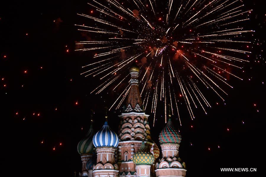 Fireworks are seen near Saint Basil's Cathedral during an event marking the 70th anniversary of Victory Day over Fascism in Moscow, Russia, May 9, 2015. (Xinhua/Pavel Bednyakov)