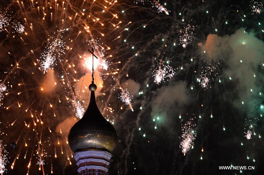 Fireworks are seen near Saint Basil's Cathedral during an event marking the 70th anniversary of Victory Day over Fascism in Moscow, Russia, May 9, 2015. (Xinhua/Pavel Bednyakov)