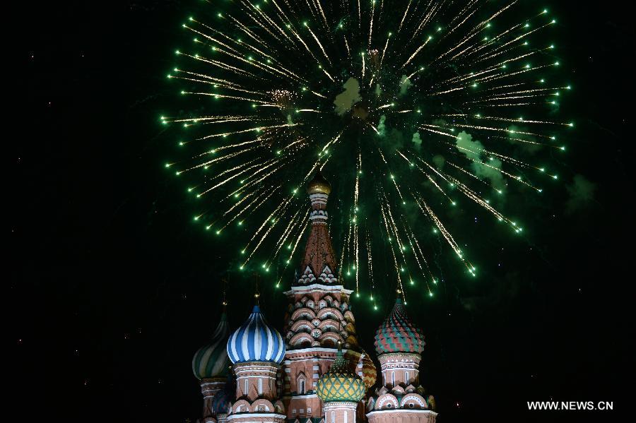 Fireworks are seen near Saint Basil's Cathedral during an event marking the 70th anniversary of Victory Day over Fascism in Moscow, Russia, May 9, 2015. (Xinhua/Pavel Bednyakov)