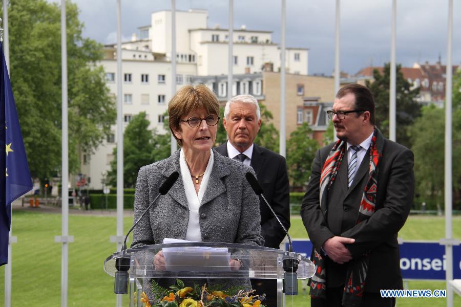 President of the Parliamentary Assembly of the Council of Europe Anne Brasseur (front) speaks during the commemorative event marking the 70th anniversary of victory in the World Anti-Fascist War at the headquarters of the Council of Europe in Strasbourg, France, May 9, 2015. (Xinhua/Lu Suyan)