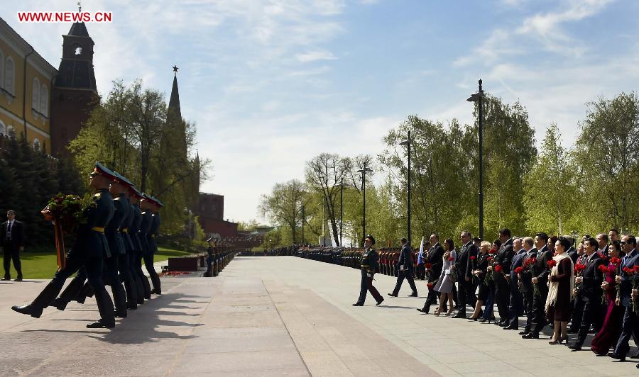 Chinese President Xi Jinping and his wife Peng Liyuan walk with other leaders and their spouses to the Tomb of the Unknown Soldier to lay red flowers after a commemorative event marking the 70th anniversary of the victory of the Great Patriotic War, in Moscow, Russia, May 9, 2015. Xi, hosted by Russian President Vladimir Putin, was among more than 20 leaders of countries, regions and international organizations to attend the commemorative event. (Xinhua/Zhang Duo)