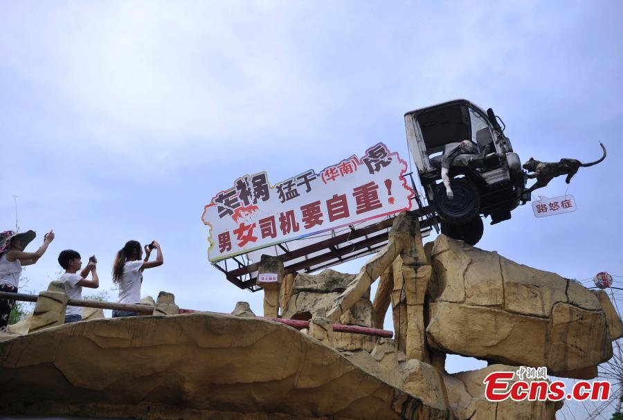 A structure depicting a car accident has been built at the entrance of the Foreigner Street theme park in Southwest China’s Chongqing municipality to warn against bad driving habits. The structure has slogans that mean “a car accident is more dangerous than a tiger and drivers would do better to have some self-respect and show less road rage”. The story of a male driver beating a female driver badly after she abruptly switched lanes has made national headlines recently, while police say many drivers easily lose their temper. (Photo: China News Service/Chen Chao)