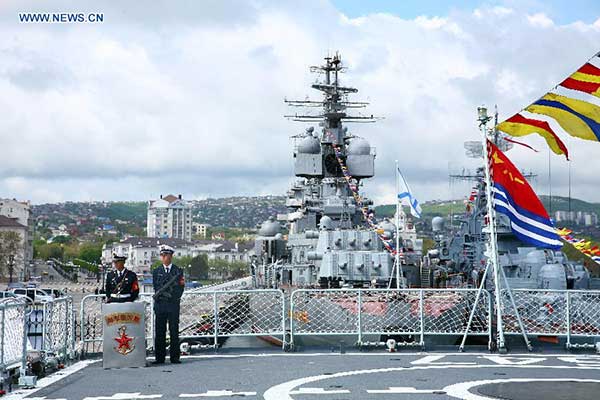 | Photo taken on May 11, 2015 shows the Chinese "Linyi" missile frigate during the launching ceremony of the "Joint Sea-2015" in the southern Russian port city of Novorossiysk. Chinese and Russian naval forces on Monday launched joint military exercises "Joint Sea-2015" in the southern Russian port city of Novorossiysk. (Xinhua/Zhang Xuanjie) |