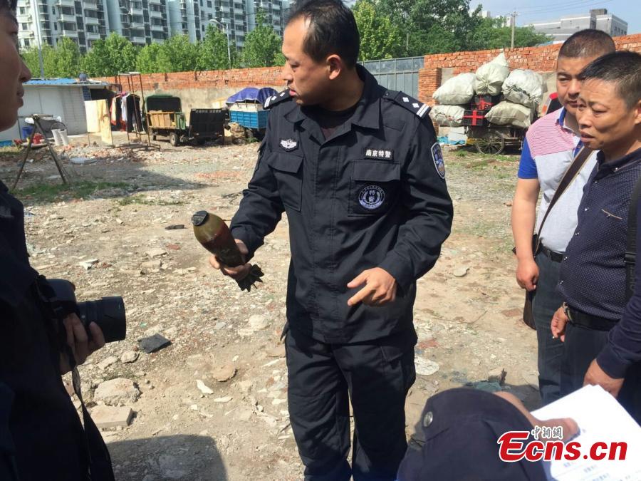 Police investigate a mortar bomb found at a waste transfer station in Nanjing city, capital of East China’s Jiangsu province, May 13, 2015. Police say the bomb still posed a threat and they had professionals of explosive ordnance disposal deal with it. (Photo: China News Service/Qian Wei) |