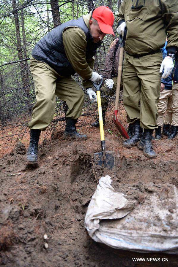 Russian team members search for remains of Soviet Union soldiers on the Huoshao Mountain in Muling City, northeast China's Heilongjiang Province, May 12, 2015. A one-month-long China-Russia search began Tuesday to locate the remains of Soviet Union soldiers who died in China fighting Japanese invaders in 1945. A 17-member Russian team, along with a group of Chinese archaeologists, are involved in the dig. (Xinhua/Wang Kai)
