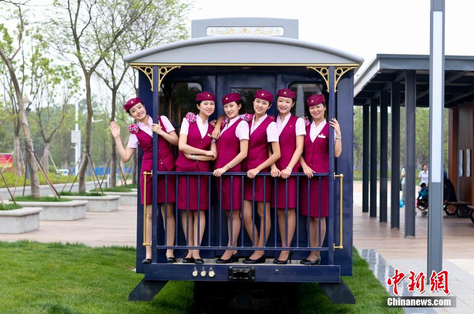 High speed rail stewardesses visit the oldest train station in Nanchang. (Chinanews/Zhang Xuedong)