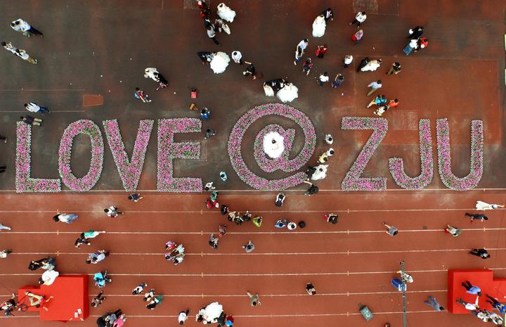 A group wedding for 360 couples is held in Zhejiang University, east China's Zhejiang province, May 10, 2015. Last Sunday was also the 118th founding anniversary of Zhejiang University. Family members, teachers and students witnessed the happiness of the 360 couples who have graduated from the university. (Photo/zjol.com.cn) |