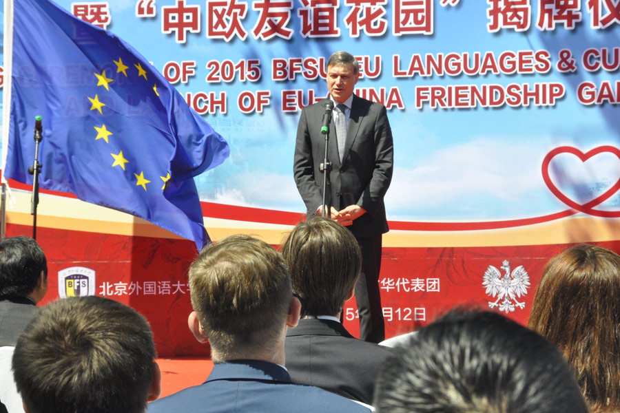 Beijing May 13 (People's Daily Online) — 2015 BFSU EU Languages and Cultures Festival was opened in Beijing on May 12, 2015. Jointly sponsored by Beijing Foreign Studies University (BFSU), EU delegation to China and Polish Embassy, the 8-day festival will feature a series of activities to promote understandings of European languages and culture among Chinese people, including academic forums, European carnival and film panorama.
