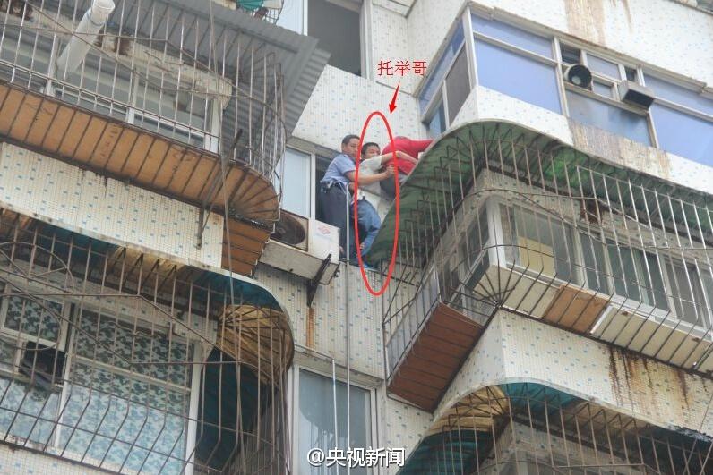 A man holds a senior who was hung out of the window of the 6th floor of an apartment building in Yichang, central China's Hubei province on May 13, 2015 until local policemen come to their rescue. The senior who forgot to take the key to home was attempting to enter through windows when the accident happened. (Official micro blog of CNTV/Wei Tie) |