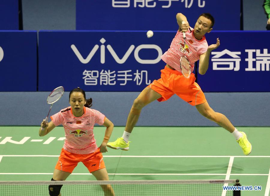 China's Zhang Nan(R)/Zhao Yunlei play against Germany's Michael Fuchs/Birgit Michels during the quarterfinal between China and Germany at 2015 Sudirman Cup BWF World Mixed Team Championships in Dongguan, south China's Guangdong Province, May 14, 2015. (Xinhua/Meng Yongmin)
