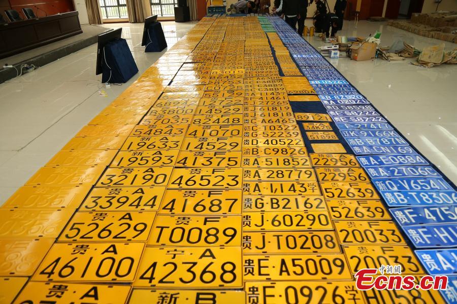 Fake car number plates, and certificates and tools used to make them on display at a press conference held by the Public Security Department of Guizhou Province, May 13, 2015. Guizhou police busted a gang producing and selling various fake car number plates and certificates across the country. They detained 26 suspects and confiscated 106,000 fake items, ranging from academic diplomas to business licenses. The amounts of money involved reached 26 million yuan($4.2 million). (Photo: China News Service/Zhong Xin)