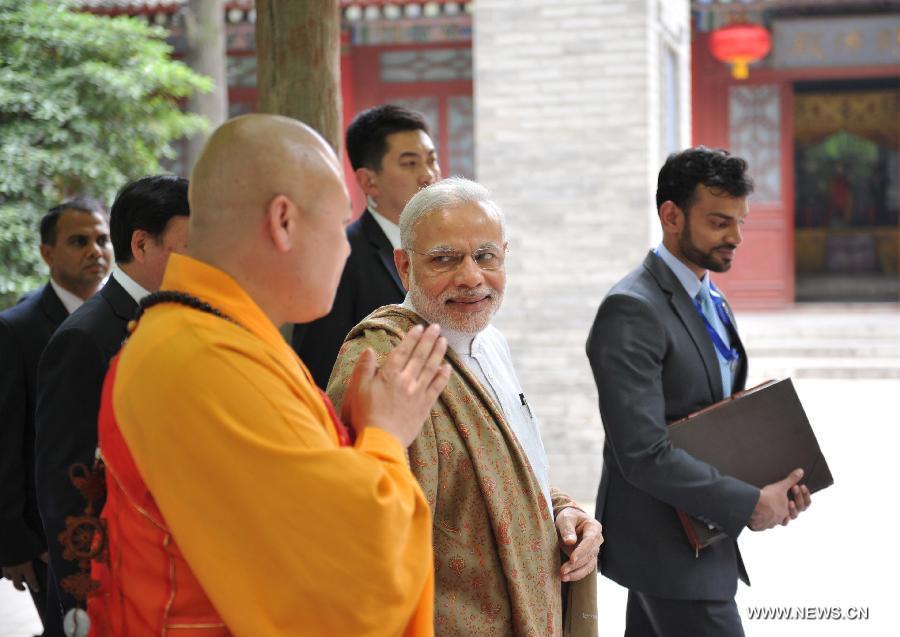 Indian Prime Minister Narendra Modi visits the Daxingshan Temple in Xi'an, capital of northwest China's Shaanxi Province, May 14, 2015. Modi arrived in Xi'an Thursday for an official visit to China. (Xinhua/Ding Haitao)